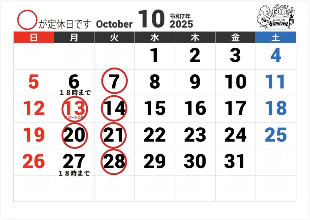 10月の定休日です