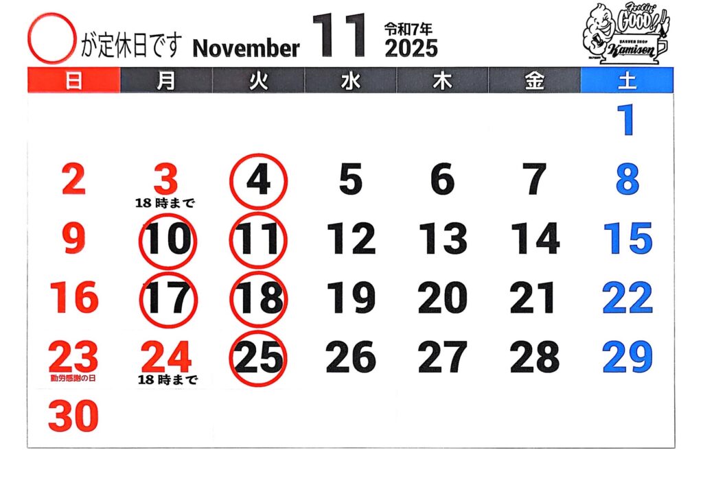 2025年10月27日 / 最終更新日時 : 2025年10月27日 owner お知らせ 11月の定休日です ⭕️が定休日です 月曜日営業日は受付が18時までになっております。 何卒よろしくお願いいたします。