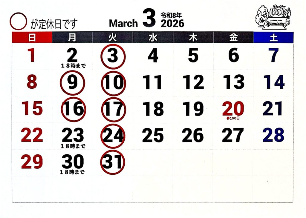 3月の定休日です